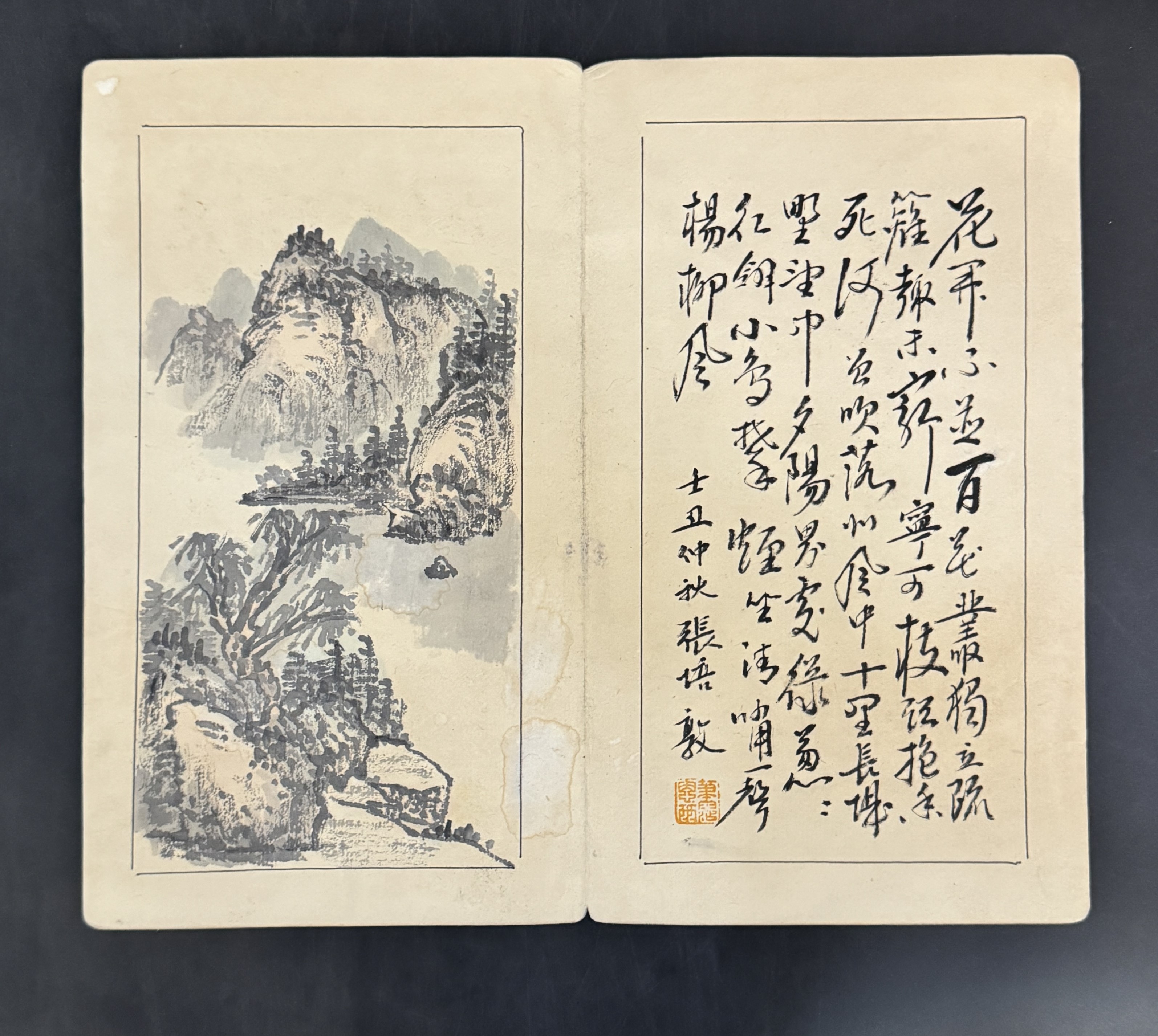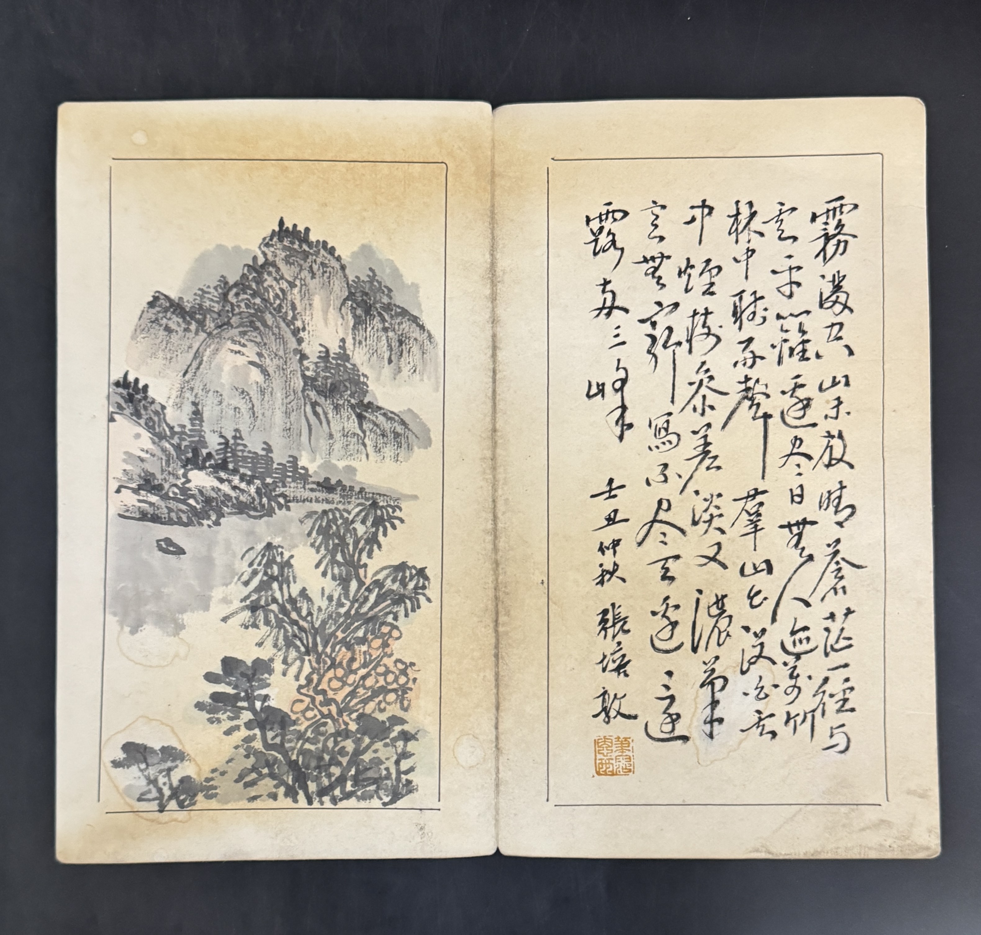 畫冊以傳統(tǒng)冊頁形式呈現(xiàn),紙張歷經(jīng)歲月已泛黃,帶有自然的陳舊痕跡,部分頁面有輕微污漬,盡顯歷史的厚重感。畫冊中既有山水畫作,又有書法作品,書畫相映成趣。山水畫采用水墨技法繪制,畫面中山峰巍峨,樹木蔥郁,江水悠遠,布局層次分明,通過濃淡不一的墨色表現(xiàn)出山水的立體感與空間感,如山峰的皴法細膩,樹木的點染生動,江水的留白空靈,將傳統(tǒng)山水畫的意境之美展現(xiàn)得淋漓盡致。書法作品則以行書書體呈現(xiàn),字體風(fēng)格飄逸灑脫,筆畫流暢自然,布局疏密得當,每一幅書法都與對應(yīng)的山水畫作在氣韻上相互呼應(yīng),體現(xiàn)出張培敦在書畫創(chuàng)作上的整體構(gòu)思與藝術(shù)造詣。