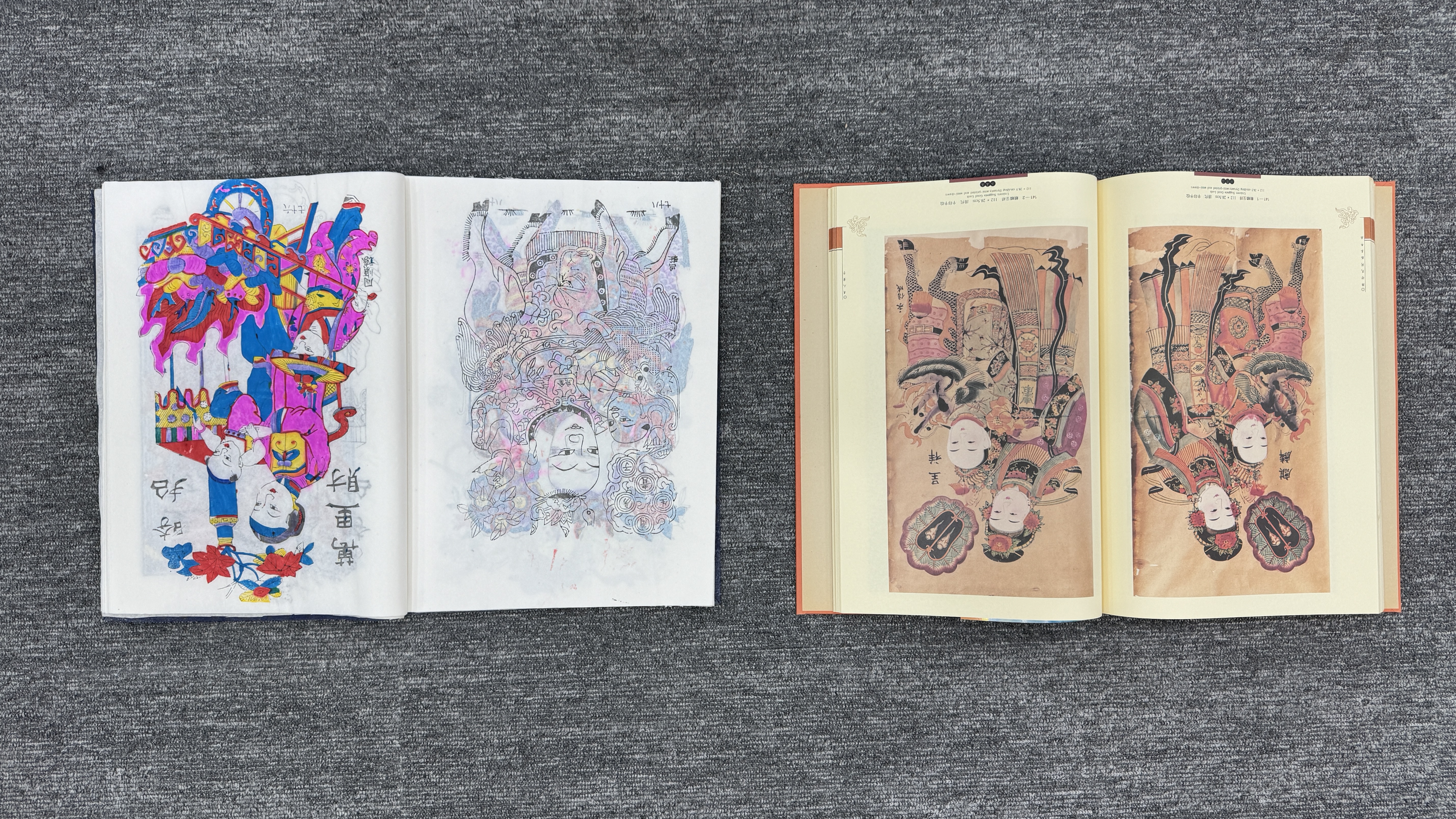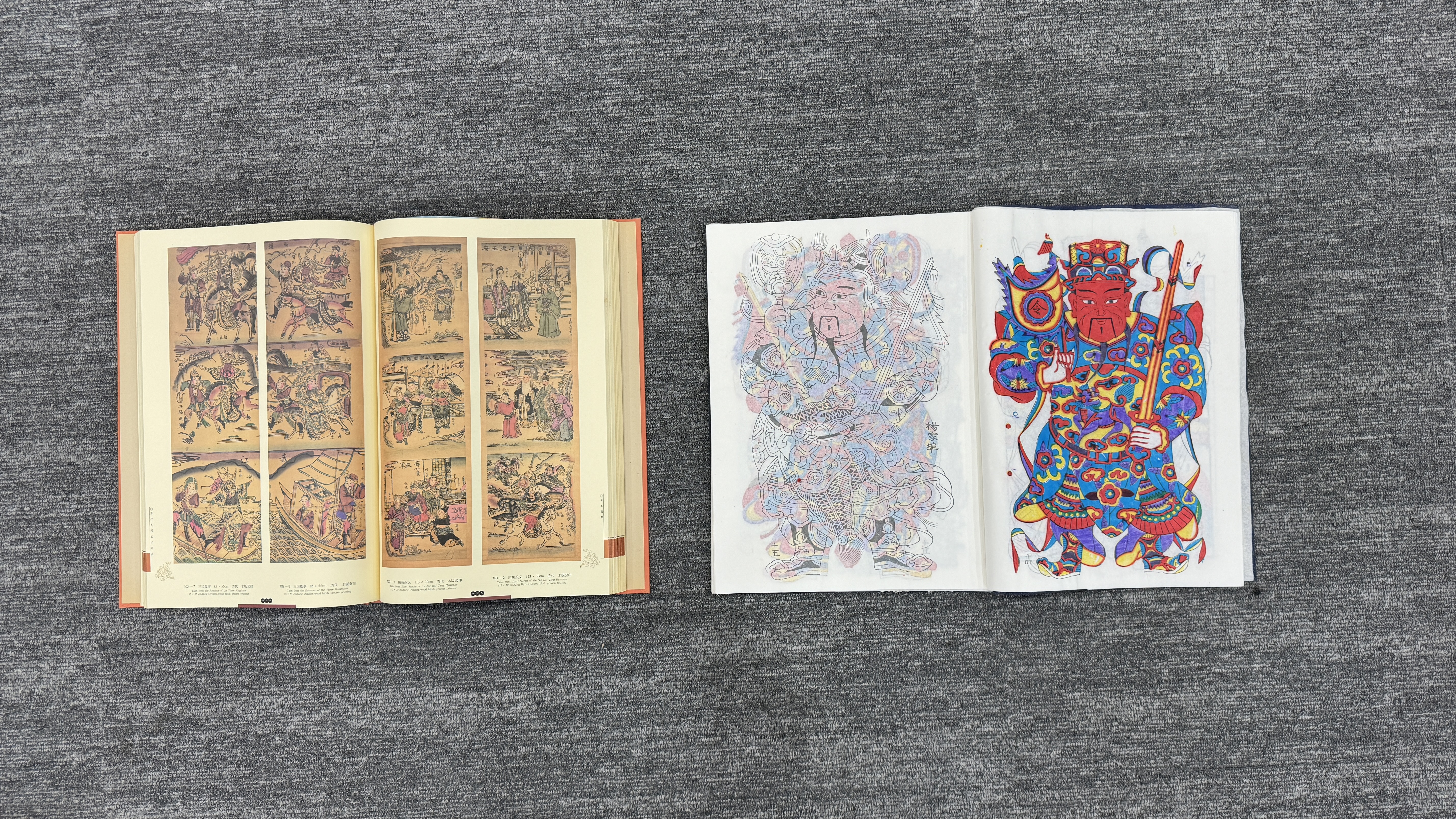 該藏品以書(shū)籍形式呈現(xiàn),其中《楊洛書(shū)濰坊楊家埠歷代年畫(huà)》與《濰坊民間孤本年畫(huà)》分別從不同維度展現(xiàn)濰坊年畫(huà)的魅力。書(shū)籍裝幀設(shè)計(jì)頗具傳統(tǒng)韻味,或采用古樸的線(xiàn)裝形式,或?yàn)楝F(xiàn)代裝幀結(jié)合傳統(tǒng)元素,封面帶有年畫(huà)主題的裝飾圖案,如吉祥娃娃、傳統(tǒng)神祇等,直觀體現(xiàn)年畫(huà)的藝術(shù)風(fēng)格。內(nèi)頁(yè)收錄的年畫(huà)作品題材豐富,涵蓋吉祥喜慶類(lèi),如“麒麟呈祥”“招財(cái)進(jìn)寶”,展現(xiàn)人們對(duì)美好生活的期盼;民俗信仰類(lèi),如門(mén)神年畫(huà),體現(xiàn)民間驅(qū)邪納福的文化心理;還有戲曲故事類(lèi),通過(guò)年畫(huà)再現(xiàn)經(jīng)典戲曲場(chǎng)景,傳播傳統(tǒng)文化。