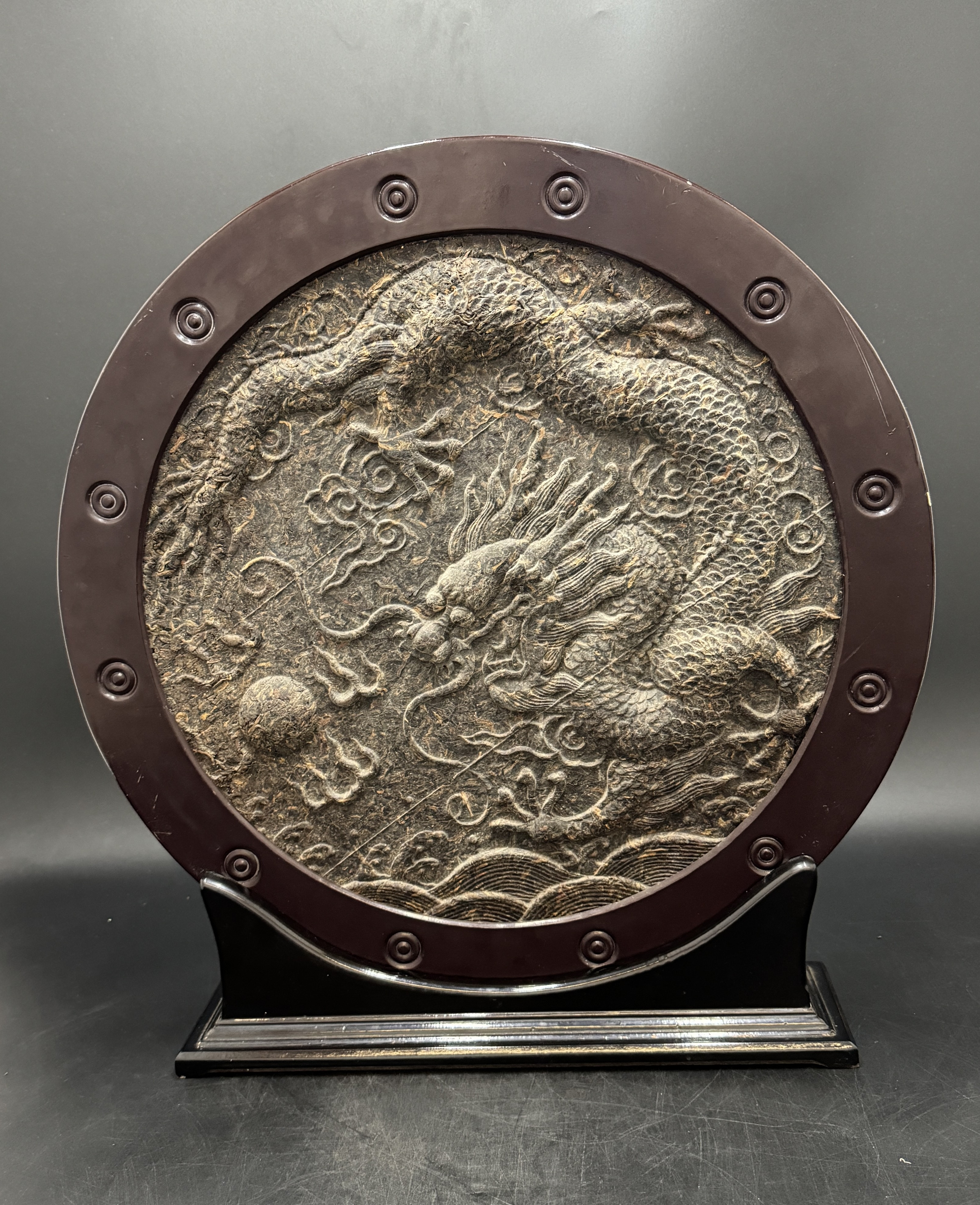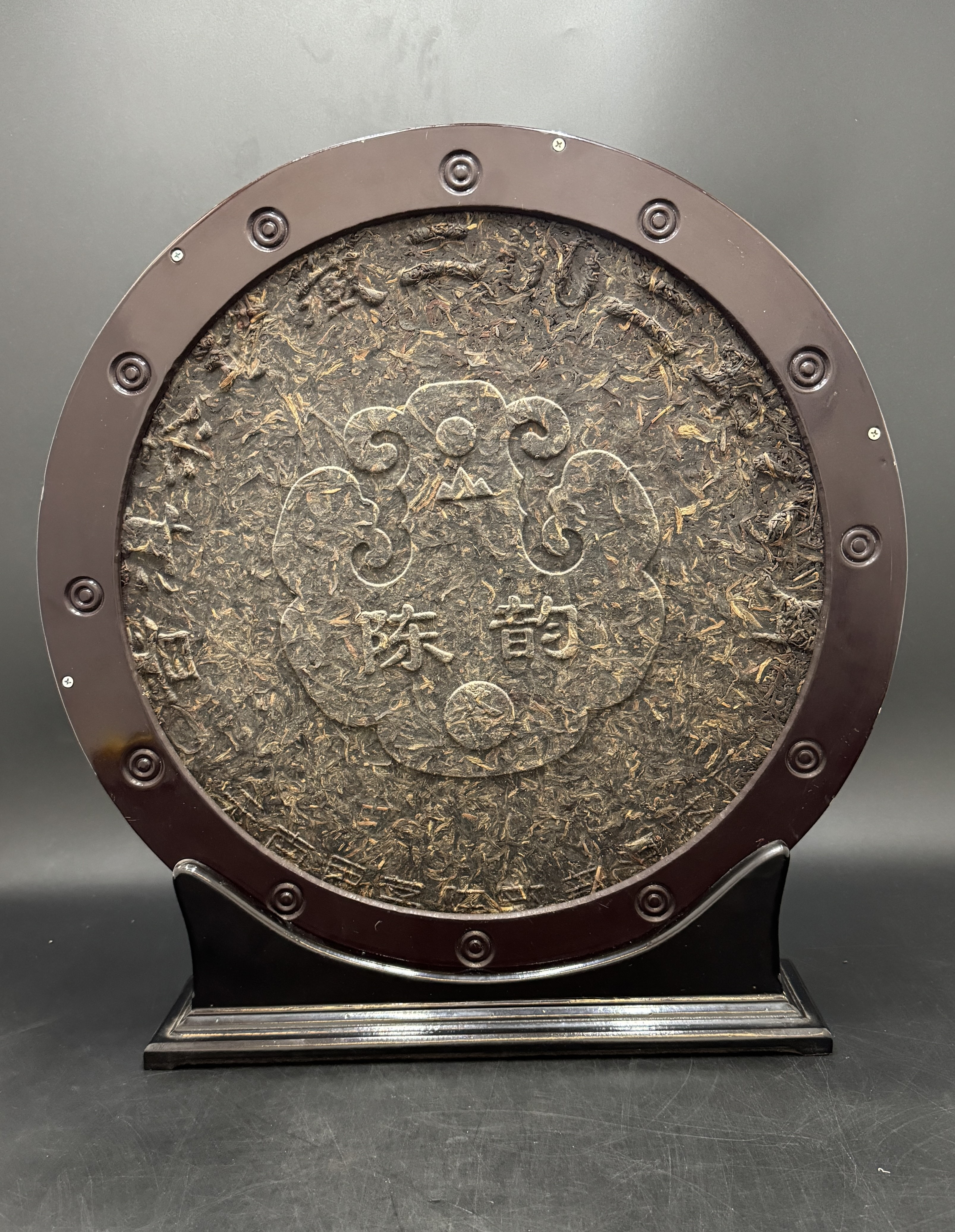該茶餅以優(yōu)質(zhì)普洱茶葉為原料,經(jīng)過(guò)二十余年的陳化,外觀呈現(xiàn)出深褐的色澤,餅面緊致規(guī)整,茶葉條索清晰且富有光澤,盡顯陳年普洱的質(zhì)感。茶餅正面雕刻有精美的龍紋圖案,龍紋神態(tài)矯健,鱗片、爪牙細(xì)節(jié)刻畫(huà)入微,周?chē)o以云紋、水波紋裝飾,工藝精湛,將傳統(tǒng)瑞獸文化與茶餅藝術(shù)巧妙融合;背面則帶有“陳韻”字樣及裝飾性紋樣,明確了其“陳韻”的品質(zhì)特征與年份屬性。茶餅被精心裝裱于帶有裝飾性圓環(huán)的底座上,整體呈現(xiàn)出擺件的形式,既保留了普洱茶餅的本質(zhì),又增添了藝術(shù)觀賞性。