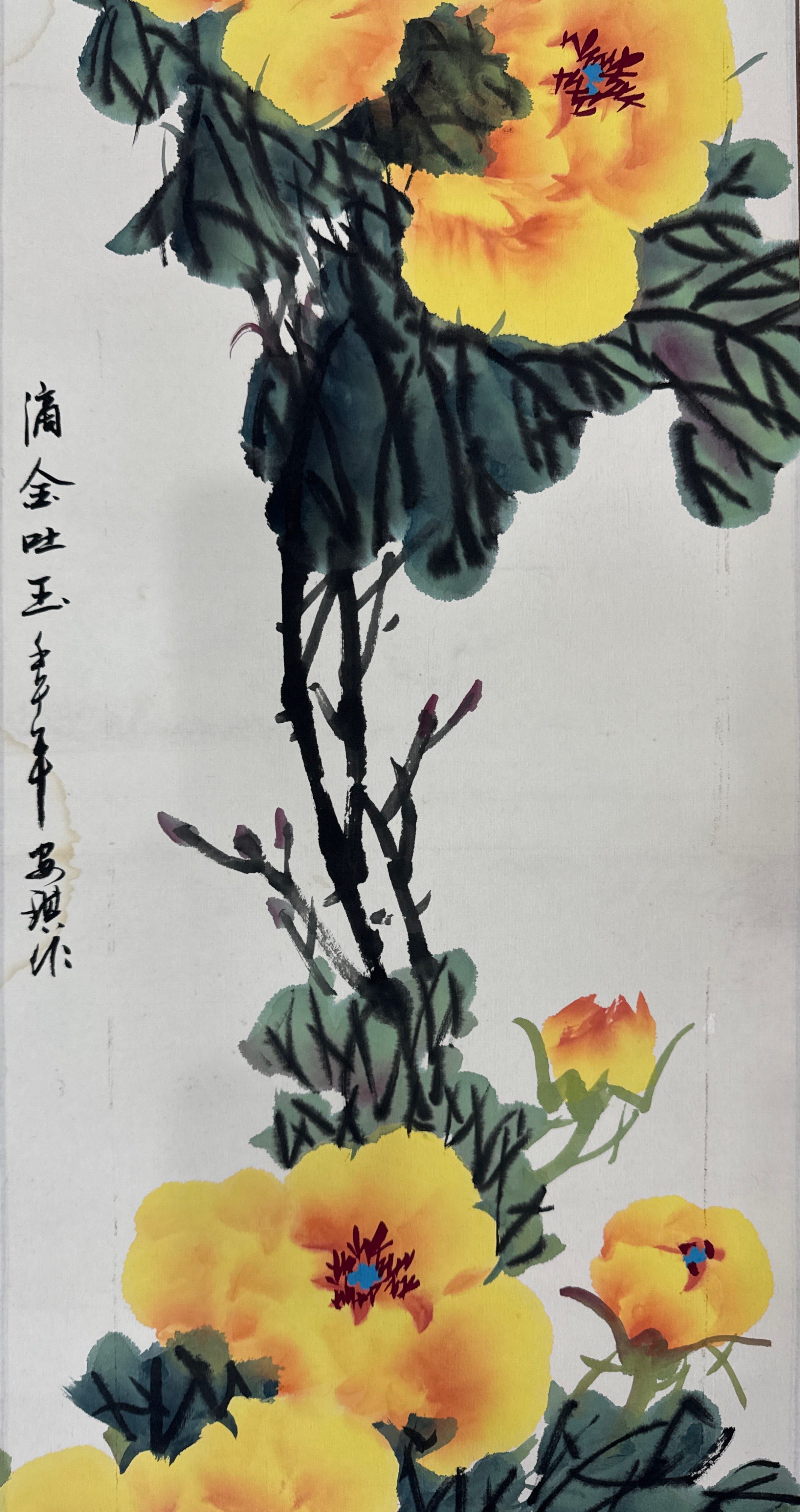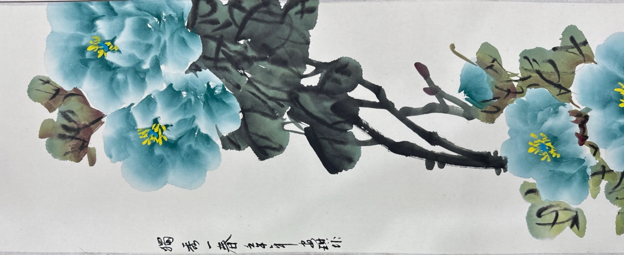 作品以傳統(tǒng)卷軸形式呈現(xiàn),紙張選用適宜書畫創(chuàng)作的宣紙,部分作品紙張帶有自然的陳舊感,更顯古樸雅致。畫面主體為牡丹,涵蓋多種色彩,如黃色、紅色、粉色、藍色等,色彩艷麗明快,層次豐富。黃色牡丹如“滴金吐玉”,色澤華貴;紅色牡丹“國色天香”,盡顯雍容;粉色牡丹“露華羞色”,嬌柔動人;藍色牡丹“獨放一春”,清新雅致。每幅作品中牡丹的形態(tài)各異,有的盛放如盤,有的含苞待放,花葉的刻畫也極為細致,葉片以濃淡不一的墨色表現(xiàn)出立體感,枝干蒼勁有力,整體構圖疏密得當,充滿生機。