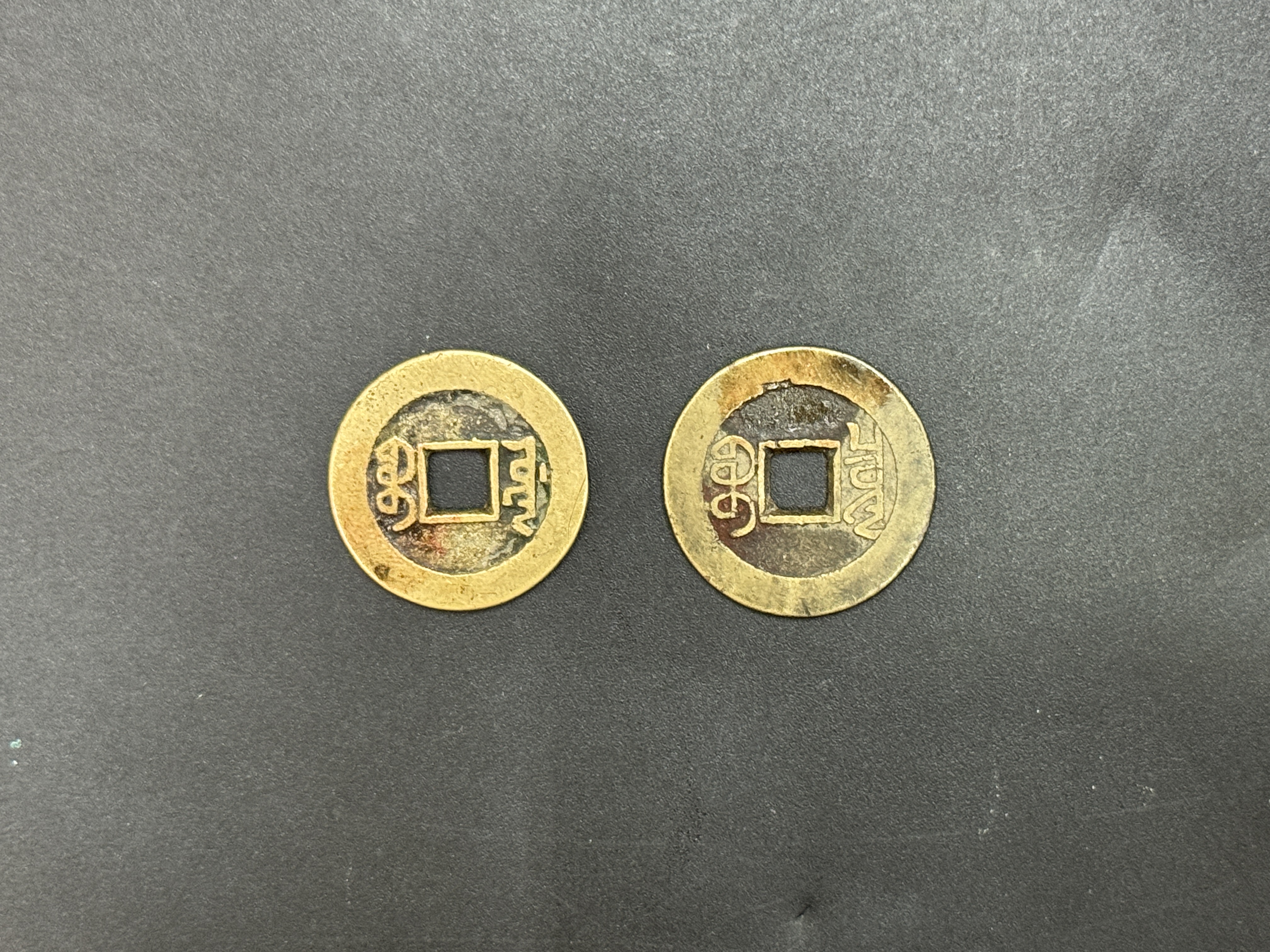 以銅為主要材質(zhì)鑄造,歷經(jīng)歲月沉淀,表面形成了厚重的氧化包漿,呈現(xiàn)出金黃、褐黑等混合色澤,幣面帶有不同程度的磨損痕跡,一枚色澤鮮亮,一枚包漿深沉,這些痕跡生動記錄了它們在歷史流轉(zhuǎn)中的使用與保存歷程,盡顯古樸滄桑的歲月質(zhì)感。錢幣整體呈圓形方孔形制,邊緣規(guī)整,厚度均勻,體現(xiàn)了清代銅錢的典型鑄造工藝特征。