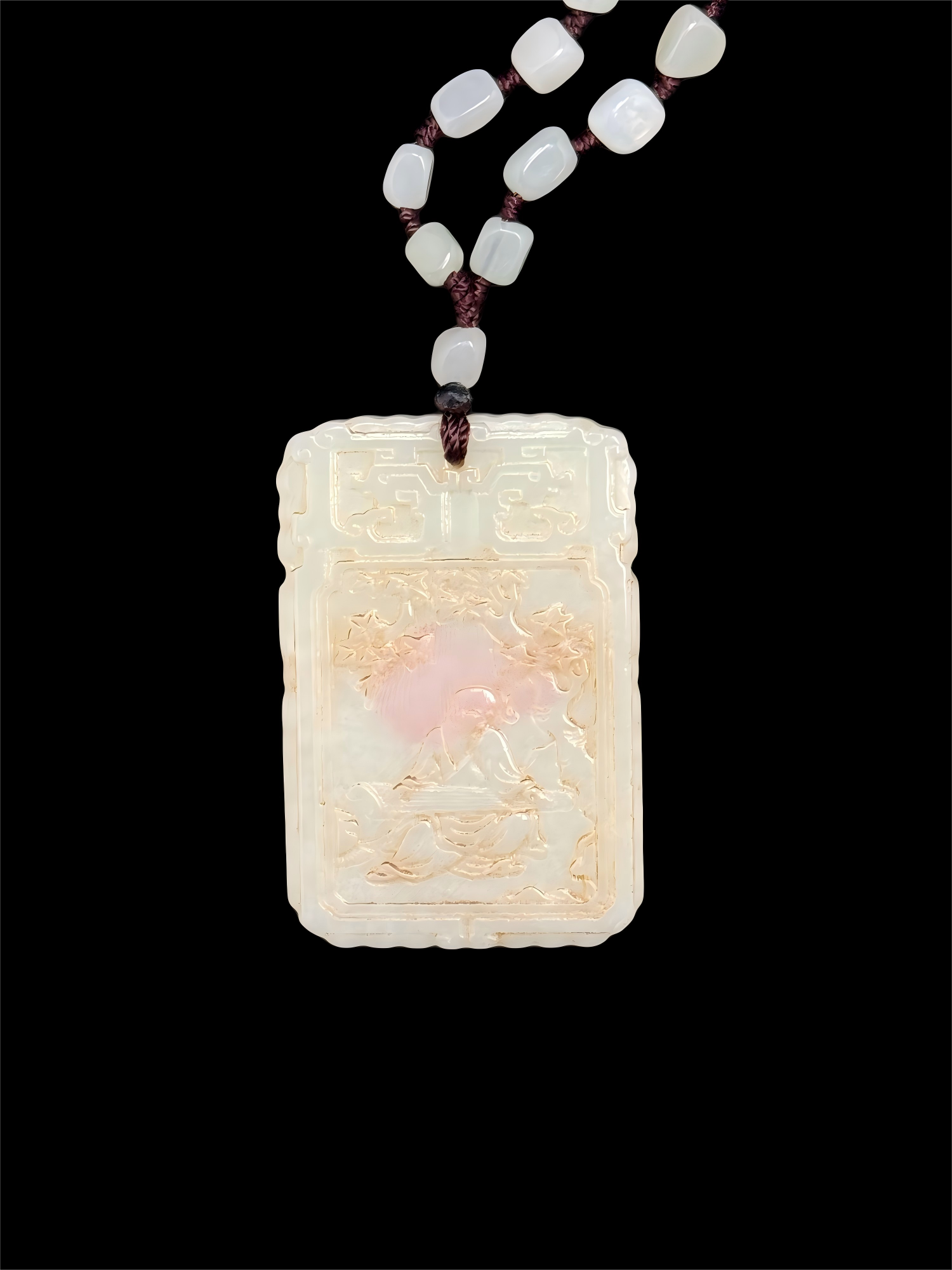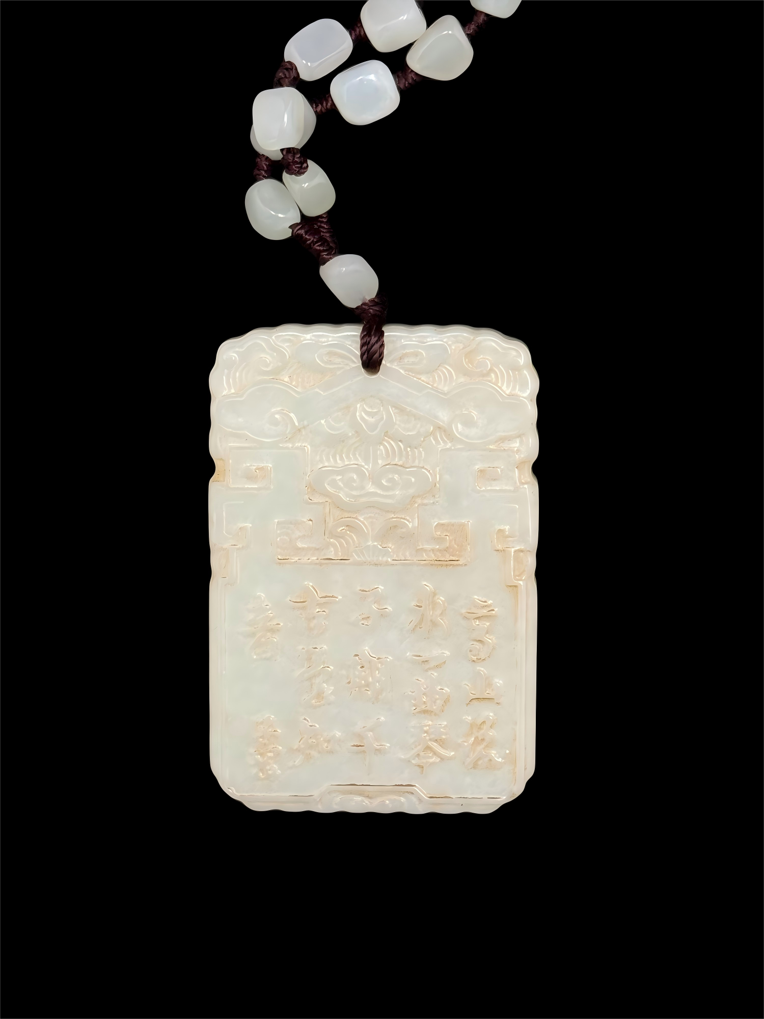 該玉牌以優(yōu)質(zhì)和田玉為材質(zhì),玉質(zhì)溫潤(rùn)細(xì)膩,呈淡白色,部分區(qū)域帶有自然的色澤變化,盡顯和田玉“溫潤(rùn)凝脂”的質(zhì)感。玉牌整體呈長(zhǎng)方形,形制規(guī)整,邊緣帶有精致的紋飾,頂部以繩結(jié)形式穿孔,便于佩戴,體現(xiàn)出實(shí)用與美觀的結(jié)合。玉牌正面雕刻有高士撫琴圖,高士神態(tài)悠然,身著寬袍大袖,端坐于樹(shù)下,撫琴姿態(tài)刻畫(huà)得細(xì)膩逼真,周圍的樹(shù)木、山石紋飾也極為細(xì)致,葉片的脈絡(luò)、山石的紋理都清晰可辨,營(yíng)造出高雅的文人意境;背面則刻有詩(shī)文“高山流水一函琴,子岡千年古意深”,字體為行書(shū),風(fēng)格飄逸灑脫,與正面的高士撫琴圖在氣韻上相互呼應(yīng),體現(xiàn)出“詩(shī)畫(huà)同源”的文人審美。