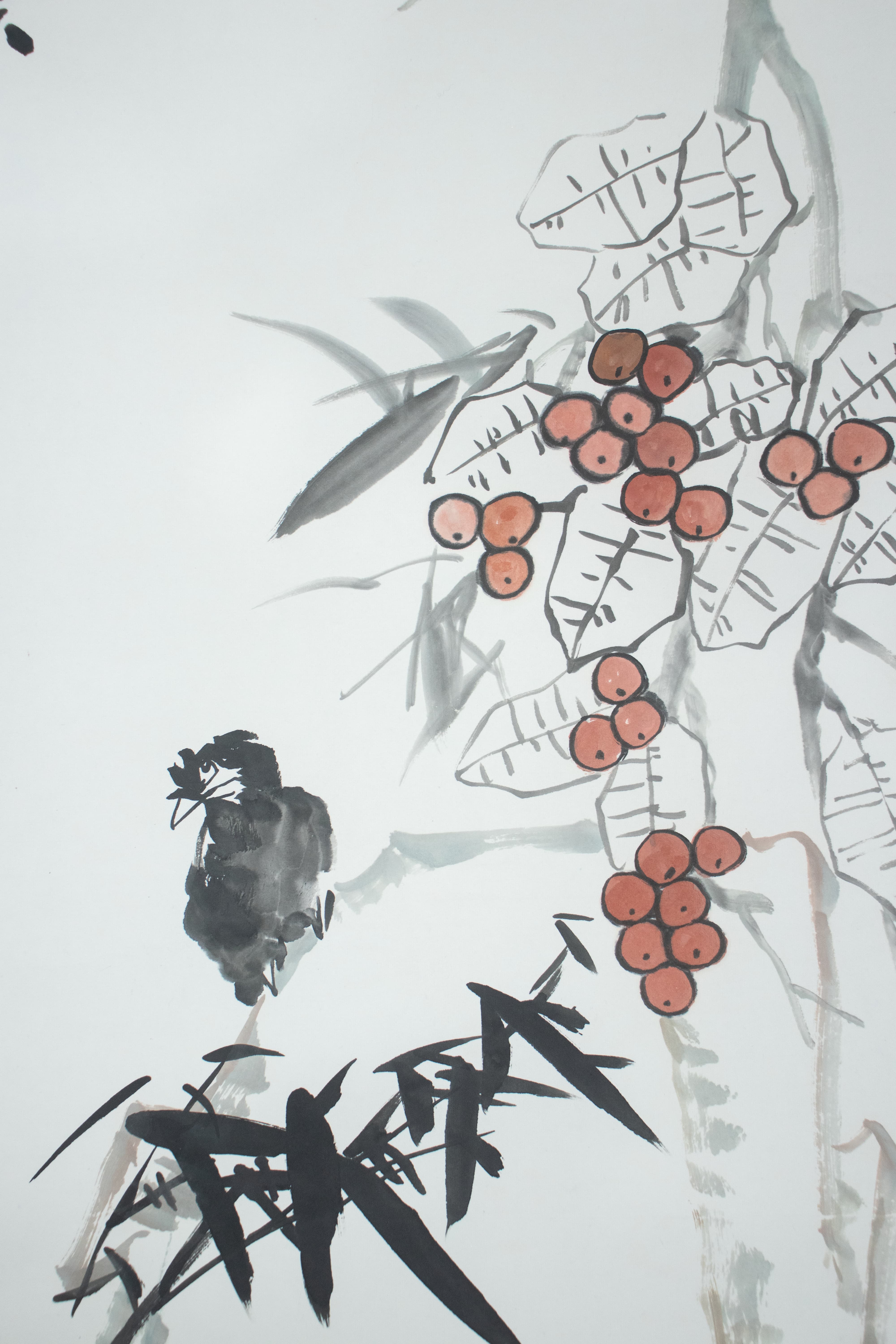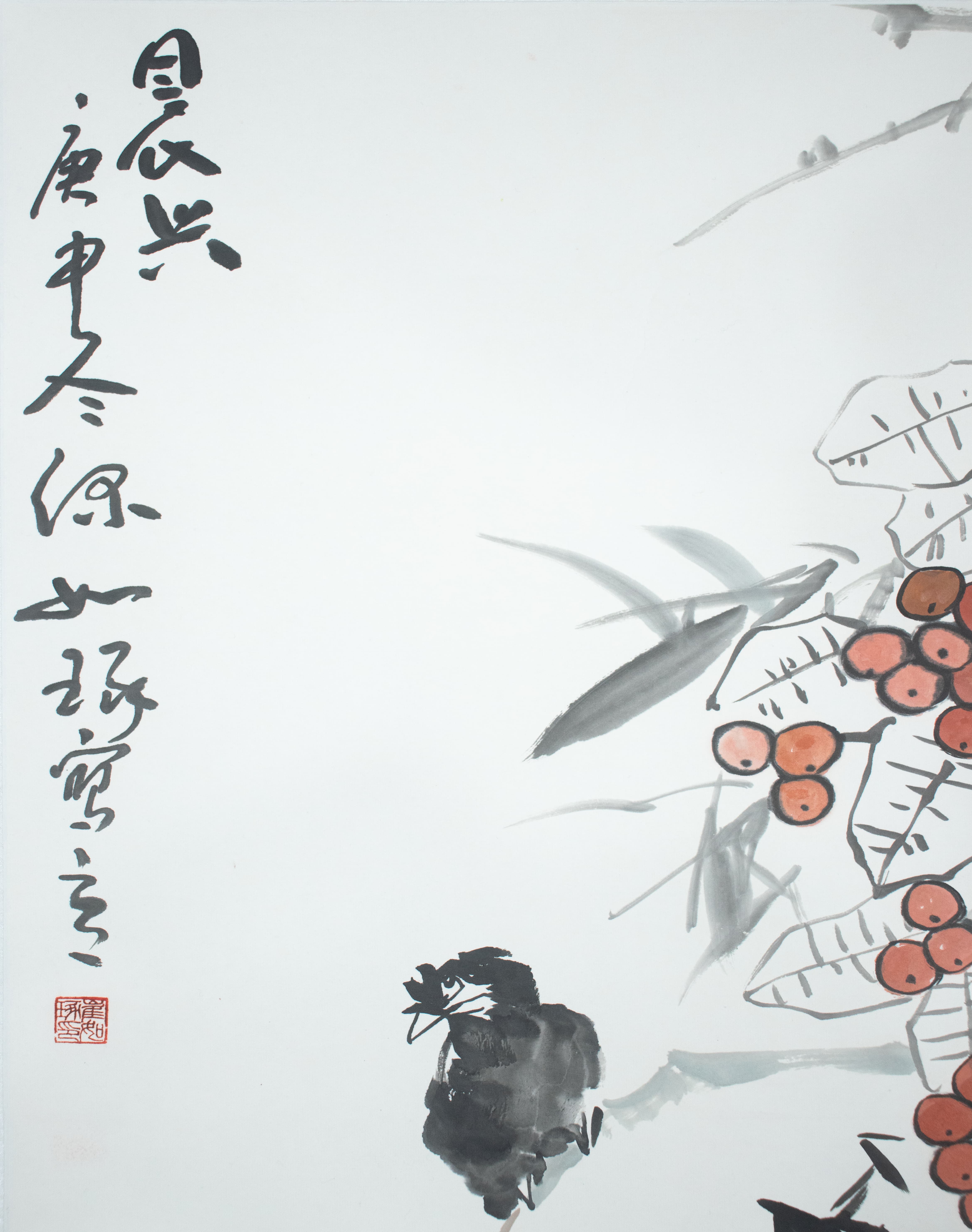 畫中竹枝竹葉以墨色濃淡表現(xiàn),筆鋒的皴擦間蘊(yùn)含板橋遺韻,塑出“瘦而不弱、勁而不霸”的骨格;那只棲于枝間的墨鳥,寥寥數(shù)筆便神態(tài)活現(xiàn),墨色的濃淡過渡中,既有厚重質(zhì)樸,更有鮮活靈動;那簇簇金黃枇杷,不追工筆的精,卻以寫意的拙,點(diǎn)染出枇杷飽滿財富的寓意;寥寥勾勒、數(shù)筆成型的山石,更顯崔如琢寫意筆法的于簡處見繁、于淡處含濃;留白的畫面,似有依稀晨嵐,又像朝霧彌漫,令人遐想無限。