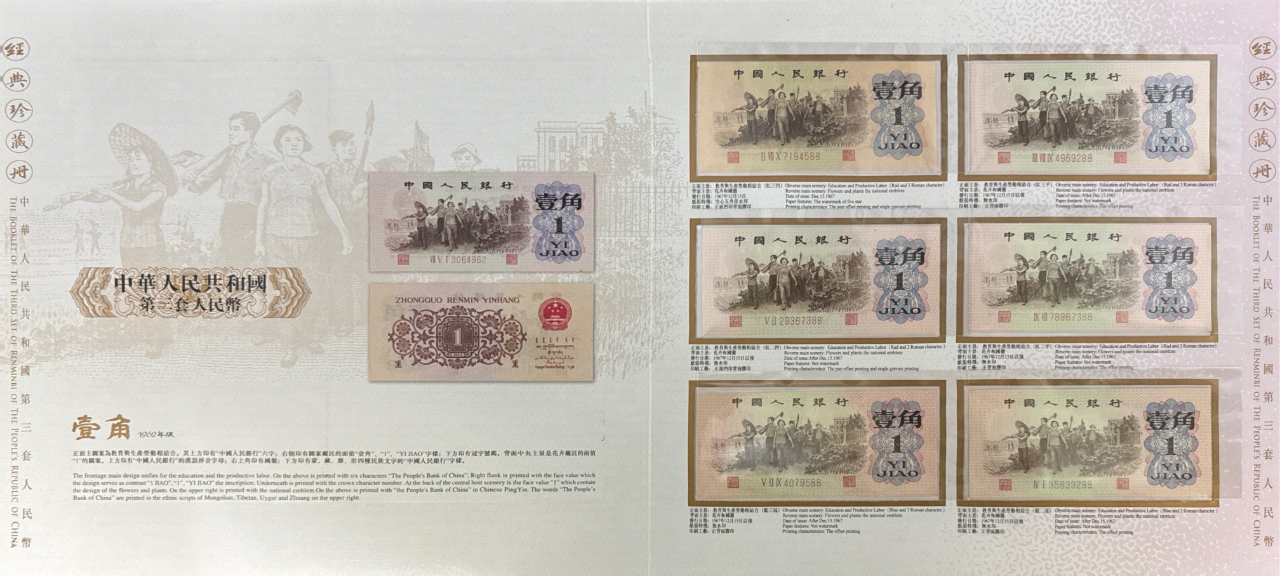 該珍藏冊(cè)以高品質(zhì)皮質(zhì)為封面,設(shè)計(jì)莊重典雅,封面上印有“中華人民共和國(guó)第三套人民幣”字樣及相關(guān)紀(jì)念徽章,徽章圖案精美,細(xì)節(jié)豐富,彰顯出珍藏冊(cè)的權(quán)威性與收藏價(jià)值。冊(cè)內(nèi)系統(tǒng)收錄了第三套人民幣的多種券別,包括壹角、伍角等,每種券別都配有詳細(xì)的文字說(shuō)明,介紹其票面設(shè)計(jì)、發(fā)行背景、印刷工藝等信息,便于收藏者與研究者深入了解。