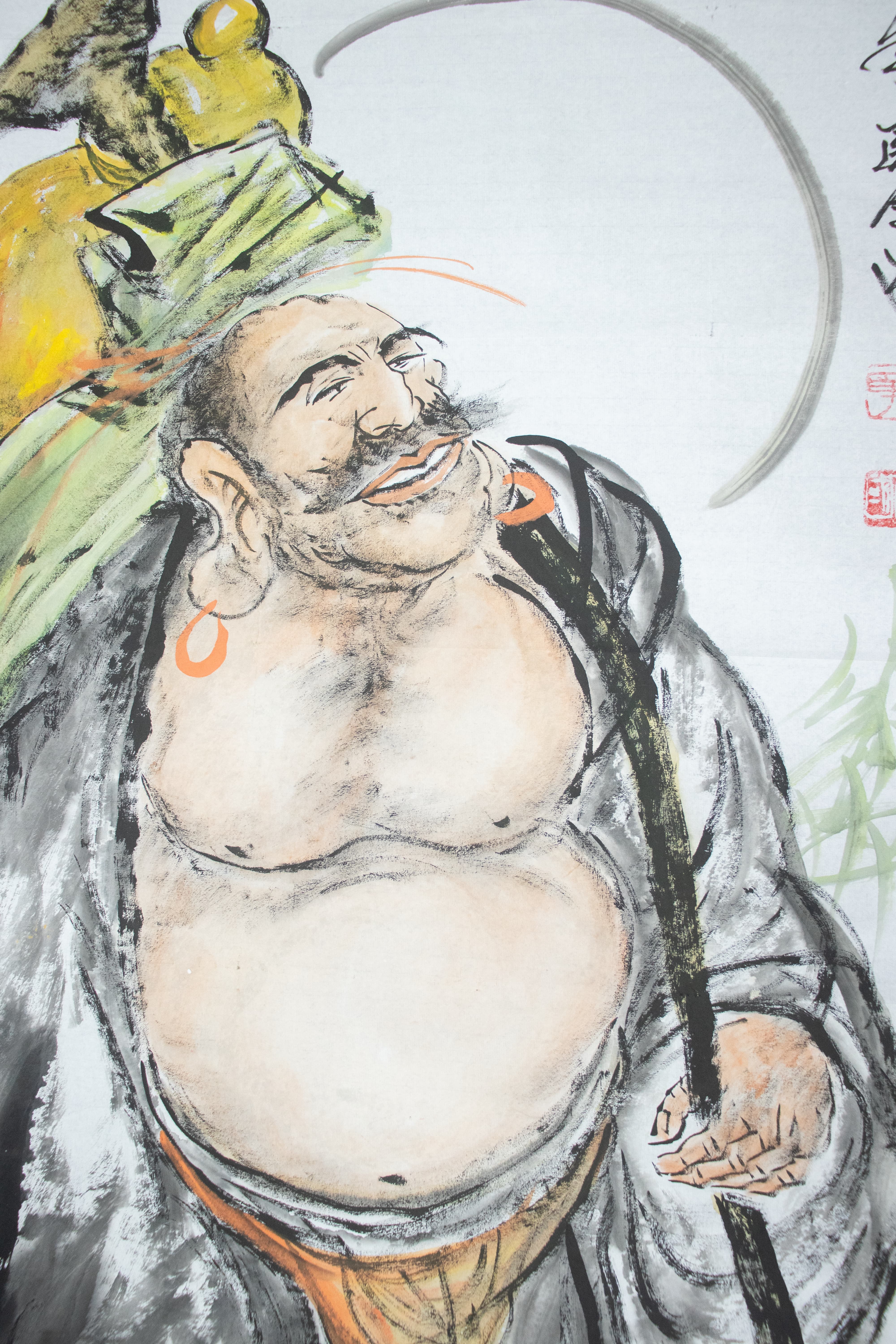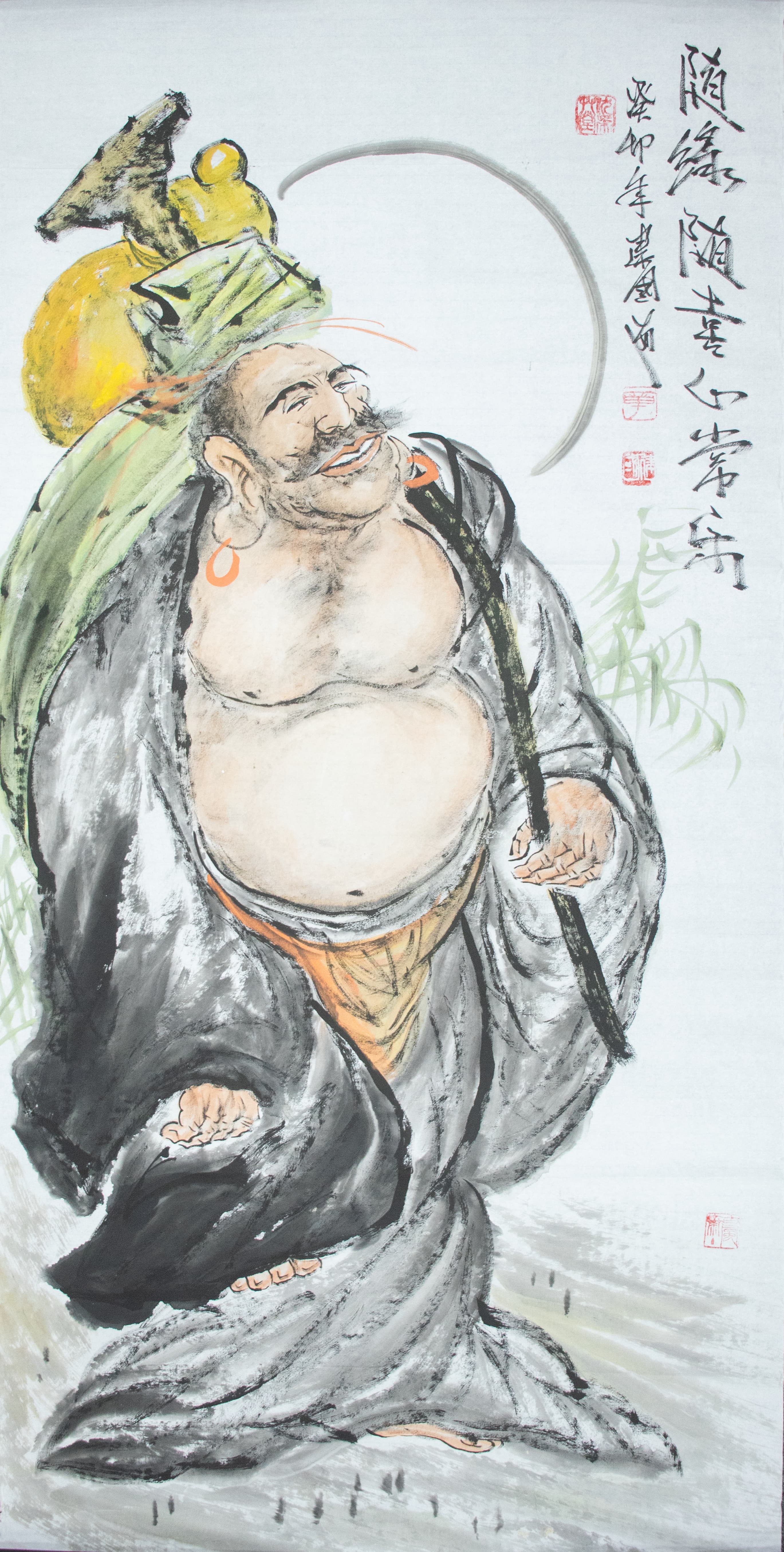 畫(huà)中彌勒袒腹大笑,那笑容里藏著豁達(dá)——不必拘泥于世俗的得失,不必困于生活的褶皺,正如他肩上那只黃綠相間的布袋,能納世間萬(wàn)物,亦能容人生悲喜。章建國(guó)以水墨的濃淡暈染出衣袍的飄逸質(zhì)感,黑色線條勾勒出肌肉的松弛與厚重,橙色耳飾與黃色布袋的色彩點(diǎn)綴,讓這尊“喜樂(lè)之佛”既具傳統(tǒng)水墨的雅致,又有民間藝術(shù)的鮮活。右手拄杖、左足輕抬的姿態(tài),似在邀觀者共赴一場(chǎng)“隨緣隨喜”的人生旅程,題字“隨緣隨喜心常樂(lè)”更是點(diǎn)破了這幅畫(huà)的精神內(nèi)核:唯有以豁達(dá)之心觀世,方能在柴米油鹽的庸常里,活出“心常樂(lè)”的自在模樣。