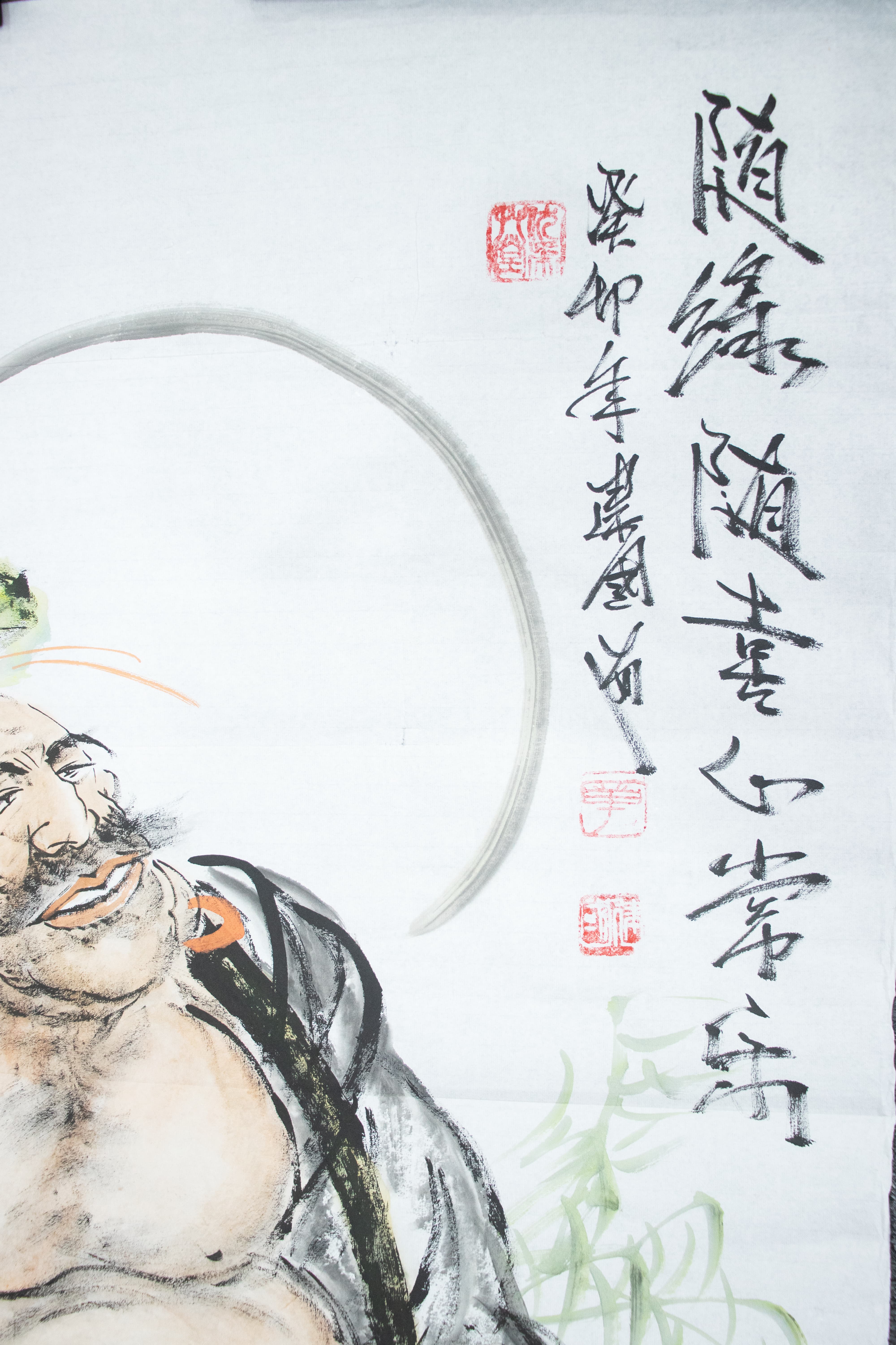 于收藏者而言,這幅《隨緣隨喜心常樂(lè)》的價(jià)值不止于紙面筆墨。章建國(guó)作為當(dāng)代古風(fēng)人物畫(huà)的代表,其作品兼具學(xué)術(shù)認(rèn)可度與市場(chǎng)潛力——他的禪意人物系列屢獲業(yè)內(nèi)好評(píng),被多家藝術(shù)機(jī)構(gòu)列為重點(diǎn)關(guān)注對(duì)象。而布袋彌勒的題材本身,在民間文化中就象征著“招財(cái)納?!?,將這幅畫(huà)懸于廳堂,便是將“喜樂(lè)福氣”請(qǐng)入家門,讓藝術(shù)收藏與生活祈愿達(dá)成美妙共振。無(wú)論是新中式風(fēng)格的書(shū)房,還是傳統(tǒng)典雅的客廳,這幅畫(huà)都能成為空間的視覺(jué)焦點(diǎn),更能在潛移默化中,將“豁達(dá)喜樂(lè)”的生活哲學(xué)融入日常。
