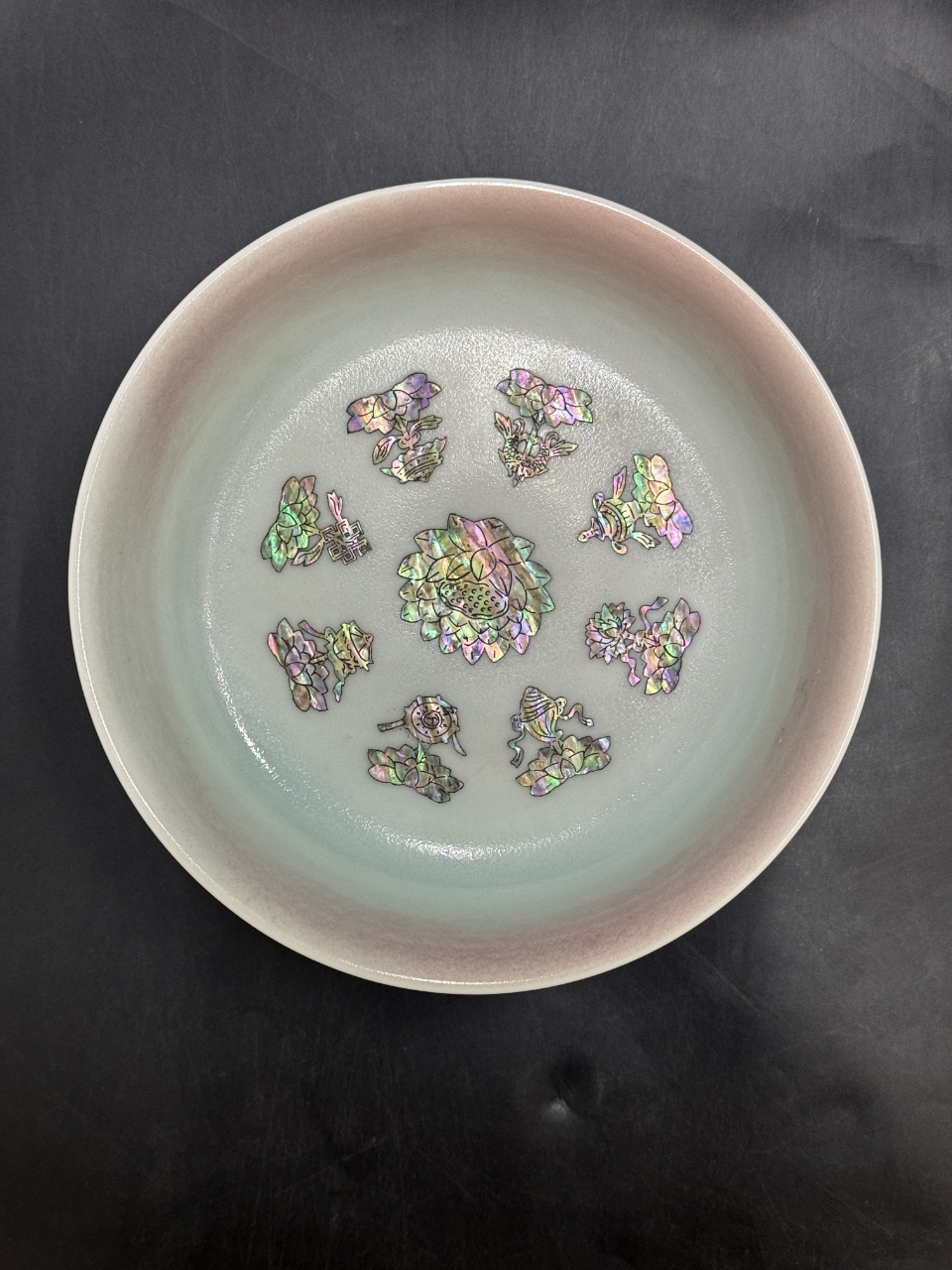 工藝上,融合了制瓷與螺鈿鑲嵌技藝。制瓷工藝中,釉色的調(diào)配與燒制精準,使得淡粉與淡青的釉色呈現(xiàn)出柔和雅致的視覺效果;螺鈿鑲嵌工藝則需將螺鈿片精細雕琢成所需圖案,再嵌入瓷盤表面,經(jīng)打磨拋光后與瓷釉融為一體,每一處鑲嵌都需精準到位,體現(xiàn)出高超的工藝水準。